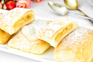Na sredino vsakega pravokotnika položi žlico jabolčnega nadeva. Robove testa prepogni in jih s prsti ali vilicami stisni skupaj, da se ne odprejo med peko.