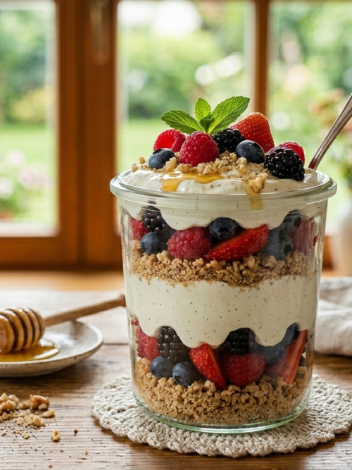 Jednostavan i ukusan recept za voćni desert sa mlevenim keksom, bobičastim voćem, rikotom, slatkom i kiselom pavlakom i mlevenim orasima. Sastojci za krem: • 250 g ri