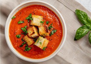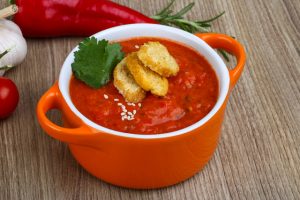 Peci paprike i paradajz u rerni dok ne pocrne (200 °C, 30 min). Oljušti ih, pomešaj sa ostalim sastojcima i izblendiraj. Posluži mlako ili hladno.